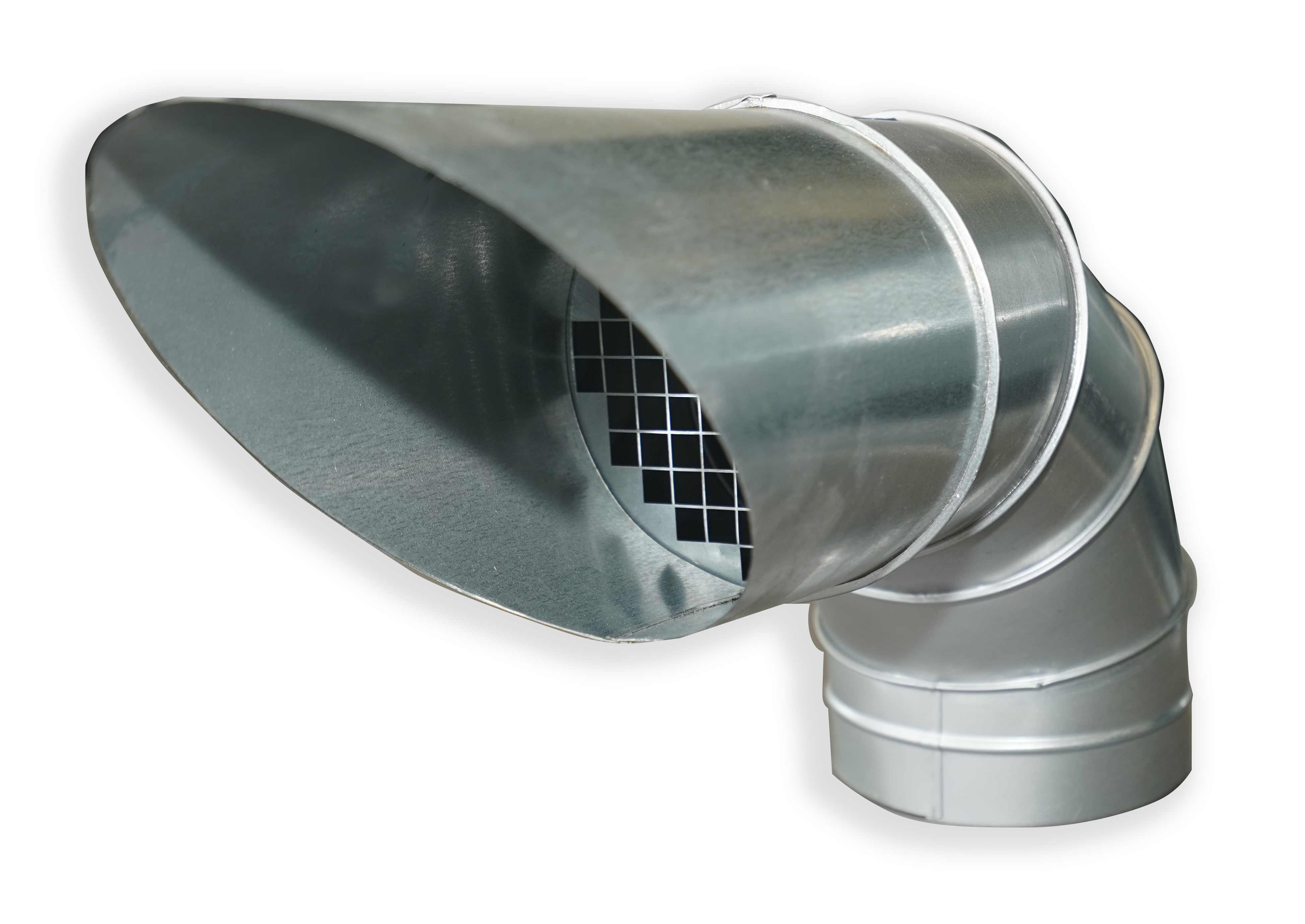 Ausblasbogen 90° mit Vogelschutzgitter aus verz. Stahlblech (Typ AB90), aus Edelstahl (Typ VA-AB90). Ausblasbogen 135° auf Anfrage.
