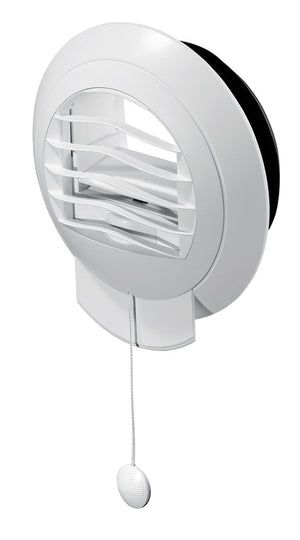 Einbaufertiges Abluftelement mit Einbauring aus weißem Kunststoff, zum Einschub in Rohre mit ND 125 mm. Bewirkt konstanten Volumenstrom bei unterschiedlichen Druckverhältnissen zwischen 40 und 160 Pa. Mittels Zugkordel zwischen Grund- und Bedarfslüftung umschaltbar. Für Wand- und Deckeneinbau geeignet.