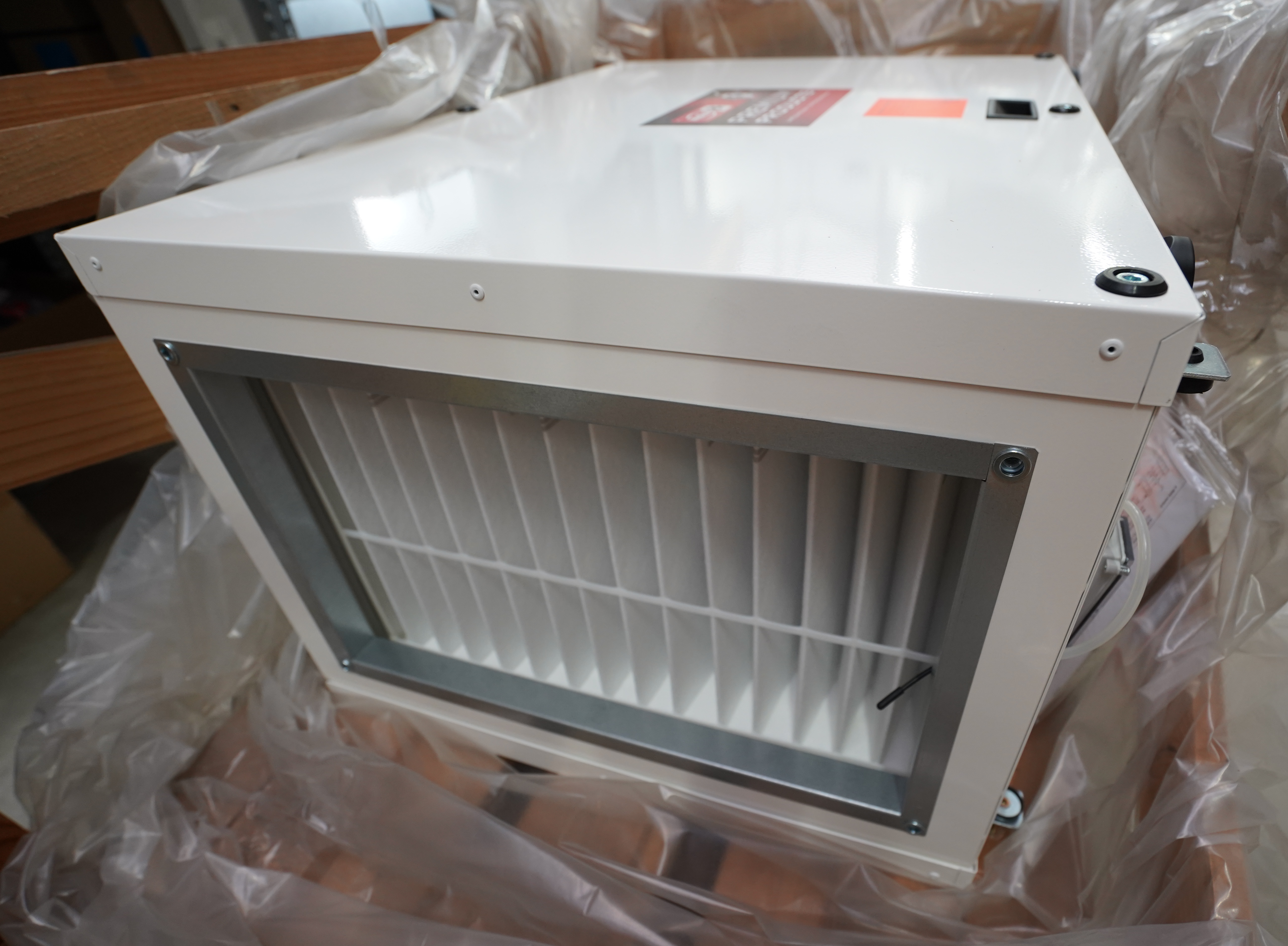 Außenluftbox mit Kassettenfilter, Heizregister und schalldämmender Innenauskleidung.