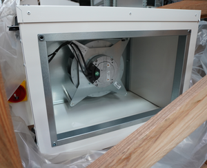 Die Geräteeinheit hat die Schutzklasse IP 20. Geräuscharmer und leistungsstarker Radialventilator. EC-Motor/Laufrad-Einheit aus verzinktem Stahlblech.