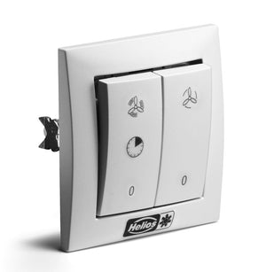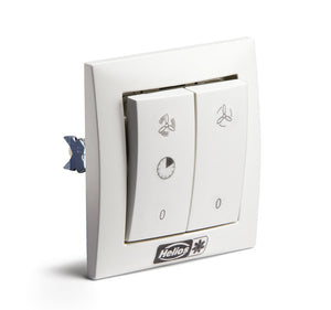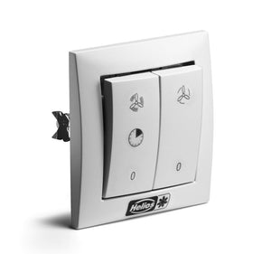 Wende- oder Drehzahlum- und Ein-Aus-Wippschalter, einetzbar zur Drehzahländerung von Ventilatoren mit zwei Leistungsstufen oder als Wendeschalter zur Förderrichtungsumschaltung von reversierbaren Ventilatoren. Front aus weißem Kunststoff. Zum Einbau in 55er UP-Dose. Schutzart IP 30, 230 V, 50/60 Hz, I max. 3 A induktiv.