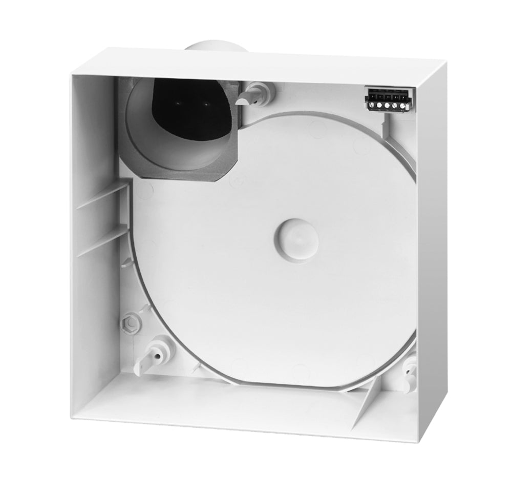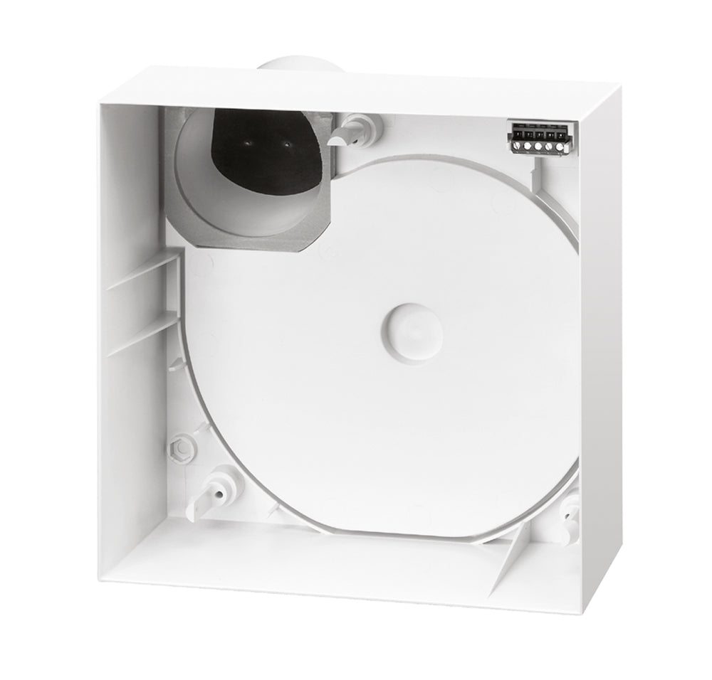 Aufputzgehäuse ohne Brandschutz, mit luftdichter Rückschlagklappe im Ausblasstutzen, für beliebige Montageposition um 90° umsetzbar. Mit Steckverbindung für elektrischen Anschluss sowie Schrauben und Dübel für Befestigung. Aus Kunststoff in weiß. Anschluss-ø Luftaustritt DN 80 mm. Einsatzgebiet Zur Lüftung von Bad oder WC. Aufputz-Wand oder Decken-Montage. Bei Anschluss an gemeinsame Hauptleitung bis zu zwei Vollgeschossen einsetzbar. Anschluss von 1 oder 2 Gehäusen pro Etage möglich.