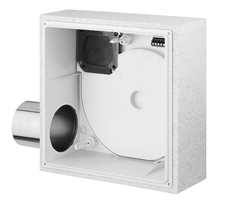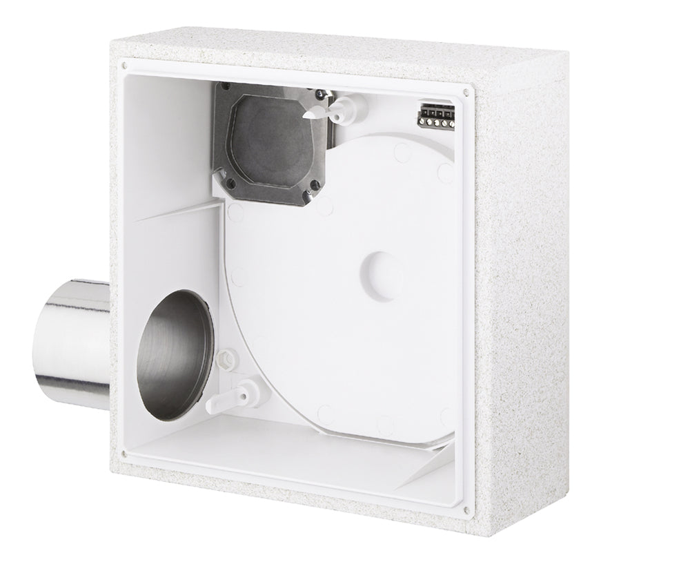 Unterputzgehäuse mit Brandschutz-Ummantelung K 90 und Zweitraumanschluss links. Ausblasstutzen für Hauptraum rückseitig und um 90° beliebig drehbar. Metall-Ausblasstutzen mit selbsttätiger Rückschlagklappe und Absperrung bei Schmelzlotauslösung. Steckverbindung für elektrischen Anschluss herausnehmbar. Wieder einsetzbarer Klapp-Putzdeckel. Anschluss DN 80 mm. Einsatzgebiet Zweiraumlüftung von Bad und WC. Einbau in Wand, Decke und K 90 qualifizierte Lüftungsschächte. Anschluss von 1 oder 2 Gehäusen pro Etage bis zu 20 Vollgeschossen möglich. Ventilator-Einsatz mit 100 m3/h empfohlen.