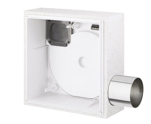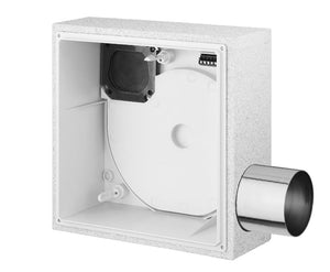Unterputzgehäuse mit Brandschutz-Ummantelung K 90 und Zweitraumanschluss rechts. Ausblasstutzen für Hauptraum rückseitig und um 90° beliebig drehbar. Metall-Ausblasstutzen mit selbsttätiger Rückschlagklappe und Absperrung bei Schmelzlotauslösung. Steckverbindung für elektrischen Anschluss herausnehmbar. Wieder einsetzbarer Klapp-Putzdeckel. Anschluss DN 80 mm. Einsatzgebiet Zweiraumlüftung von Bad und WC. Einbau in Wand, Decke und K 90 qualifizierte Lüftungsschächte. Anschluss von 1 oder 2 Gehäusen pro Etage bis zu 20 Vollgeschossen möglich. Ventilator-Einsatz mit 100 m3/h empfohlen.