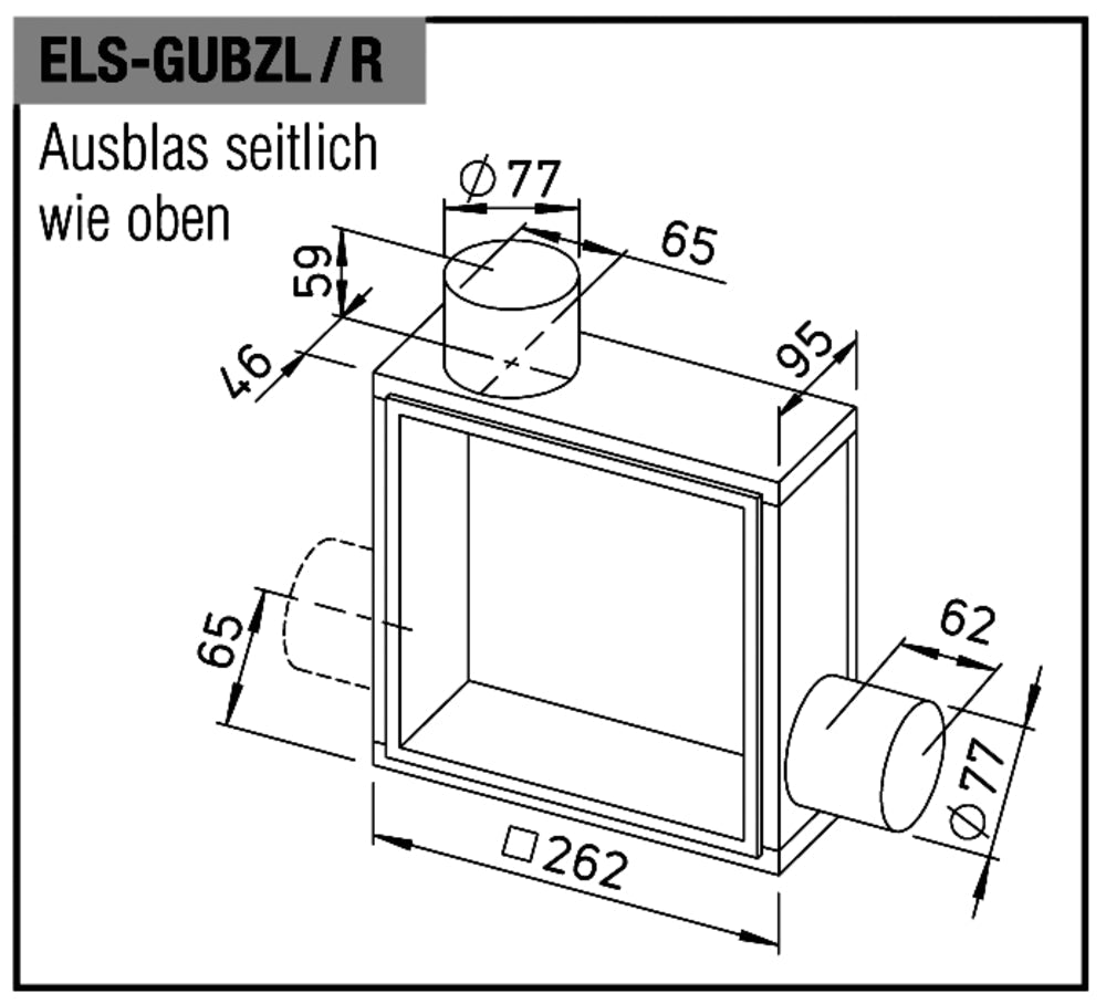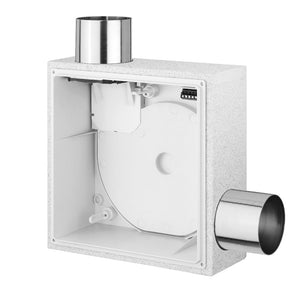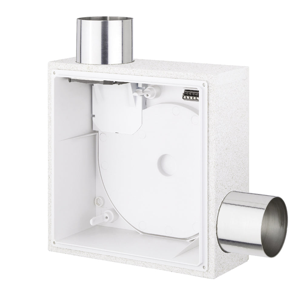 Unterputzgehäuse mit Brandschutz-Ummantelung K 90 und Zweitraumanschluss rechts. Ausblasstutzen für Hauptraum seitlich, nach oben (Lieferweise), links oder rechts drehbar. Metall-Ausblasstutzen mit selbsttätiger Rückschlagklappe und Absperrung bei Schmelzlotauslösung. Steckverbindung für elektrischen Anschluss herausnehmbar. Wieder einsetzbarer Klapp-Putzdeckel. Anschluss DN 80 mm. Einsatzgebiet Zweiraumlüftung von Bad und WC. Einbau in Wand, Decke und K 90 qualifizierte Lüftungsschächte. Anschluss von 1 oder 2 Gehäusen pro Etage bis zu 20 Vollgeschossen möglich. Ventilator-Einsatz mit 100 m3/h empfohlen.