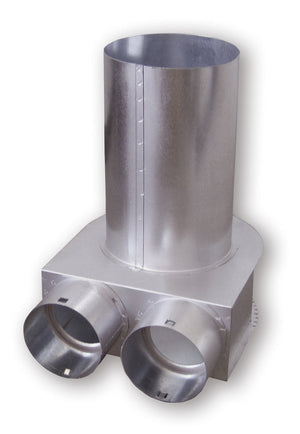 Deckenkasten zum Anschluss von Zu- oder Abluftventilen DN 125 (Zubehör) und 2 Anschlüssen NW 63 bzw. 75. Aus verzinktem Stahlblech, korrosionsbeständig.