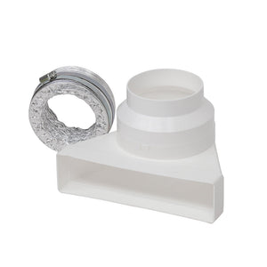 90°-Umlenkstück von rund auf eckig. Stecksystem aus Kunststoff, Farbe weiß. Maße: 218 mm x 55 mm (äquivalenter Querschnitt 125 mm).