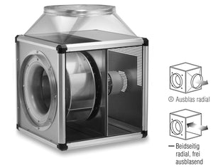 Kubische Lüftungsbox mit druck- und saugseitig verlustarmen Rohranschlussstutzen inkl. flexibler Manschetten (für Temperaturen bis 120°C geeignet) zur Unterbindung von Körperschall. Variabel einsetzbare Gehäusepaneelen für optimale Anpassung an bauliche Gegebenheiten. Motor außerhalb des Luftstromes liegend, deshalb einsetzbar zur Förderung von verschmutzter, heißer Luft bis max. 120 °C. Serienmäßig mit Kondensatwanne und beiliegendem Kondensatablauf. Einsatzbereich: Gewerbliche Küchen und viele Anwendungen der Prozesstechnik. Einfache Positionierung durch serienmäßige Kranhaken. Selbstragende Gehäuse-Rahmenkonstruktion aus Aluminium-Hohlprofilen. Doppelwandige, 20 mm starke Seitenpaneele aus verzinktem Stahlblech, schall- und wärmeisoliert durch Auskleidung mit nicht brennbarer Mineralwolle. Hochleistungs-Radial-Laufrad mit rückwärts gekrümmten Aluminium-Schaufeln auf verzinkter Stahlscheibe, direkt angetrieben. Vibrationsfreier Lauf durch dynamische Wuchtung zusammen mit dem Motor entsprechend Gütestufe 6.3 nach DIN ISO 1940 T.1. Antriebsmotor in geschlossener, wartungsfreier Bauweise, außerhalb des Förderstromes liegend. Drehzahl durch Spannungsreduzierung steuerbar, eingebaute auf Klemmleiste herausgeführte Thermokontakte, geschlossene, geräuscharme Kugellager mit Langzeitschmierung. Netzanschluss am im Gerät integrierten Klemmenkasten (IP54).