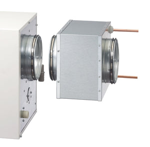 Niedertemperaturnachheizregister zum Anschluss an die HygroBox KWL HB 500 WW bei Niedertemperaturheizsystemen. Bestehend aus Warmwasserheizregister mit Rohranschluss DN 250 mm und externem PT 1000 Temperaturfühler.