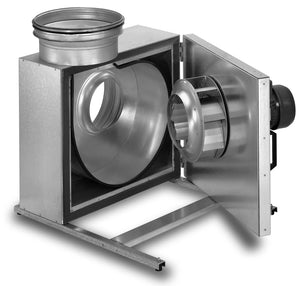 Geräuschgekapselter Radial-Ventilator mit ausschwenkbarer Motor-Laufradeinheit und außerhalb dem Luftstom liegenden Motor.Doppelwandiges Gehäuse aus verzinktem Stahlblech, schallisoliert durch Auskleidung mit 50 mm starken Mineralwoll-Dämmstoff-Platten. Saug- und druckseitige Rohranschlußstutzen mit Gummilippendichtung. Ventilatortür für Inspektion und Reinigung voll ausschwenkbar. Incl. stabiler Montageschienen mit vier Schwingungsdämpfern.Hochleistungs-Radial-Laufrad mit rückwärtsgekrümmten Schaufeln aus Aluminium. Vibrationsfreier Lauf durch dynamische Wuchtung nach Gütestufe G 6.3 VDI 2060 und DIN ISO 1940.Einphasen-Wechselstrom-Kondensator-Motor, geschlossene Bauweise, wartungsfrei, mit in die Wicklung eingebauten Thermokontakten, drehzahlsteuerbar durch Spannungs- reduzierung, gedichtete, geräuscharme Kugellager mit Langzeitschmierung, nicht reversierbar.
