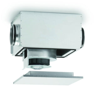 EC Radial-Rohrventilator mit geräuschgedämpftem Gehäuse. Schalldämmendes Gehäuse aus verzinktem Stahlblech mit runden Anschlußstutzen auf Normrohre abgestimmt. Schallabsorbierende Lochblech-Innenauskleidung, mit 50mm starker Mineralfaserplatte hinterlegt. Deckel abnehmbar. Ventilatorraum und Gehäusespirale frei zugänglich. Motor und Laufrad ausschraubbar. Laufrad: Energiesparendes Radiallaufrad mit rückwärts gekrümmten Schaufeln. Für geräuscharmen Lauf dynamisch gewuchtet. Antrieb durch energiesparenden, drehzahlsteuerbaren EC-Außenläufermotor in Schutzart IP44 mit höchstem Wirkungsgrad. Wartungs- und funkstörungsfrei, kugelgelagert. Integrierte elektronische Temperaturüberwachung für EC-Motor und Elektronik. Stufenlose Drehzahlsteuerung mit Potentiometer oder stufenlose Drehzahlregelung mit Universal-Regelsystem EUR-EC. Anschluss über serienmäßiger Klemmenkasten (IP55) außen am Gehäuse.