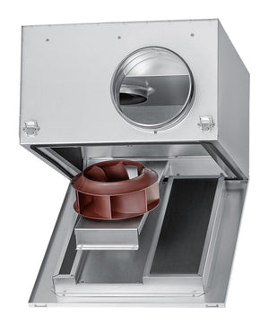 EC Radial-Rohrventilator mit geräuschgedämpftem Gehäuse. Gehäuse aus verzinktem Stahlblech mit runden Anschlussstutzen auf Normrohre abgestimmt. Schallabsorbierende Lochblech-Innenauskleidung, mit 50mm starker Mineralfaserplatte hinterlegt. Deckel abnehmbar. Ventilatorraum und Gehäusespirale frei zugänglich. Motor und Laufrad ausschwenkbar. Laufrad: Energiesparendes Radiallaufrad mit rückwärts gekrümmten Schaufeln. Für geräuscharmen Lauf dynamisch gewuchtet. Antrieb durch energiesparenden, drehzahlsteuerbaren EC-Außenläufermotor in Schutzart IP54 mit höchstem Wirkungsgrad. Wartungs- und funkstörungsfrei, kugelgelagert. Integrierte elektronische Temperaturüberwachung für EC-Motor und Elektronik. Stufenlose Drehzahlsteuerung mit Potentiometer oder stufenlose Drehzahlregelung mit Universal-Regelsystem EUR-EC. Anschluss über serienmäßiger Klemmenkasten (IP54) an ausgeführten Kabel.
