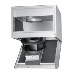 Kanal-Radialventilator schallgedämmt zur direkten Montage in rechteckiges Kanalsystem, Ventilator-Einheit herausschwenkbar.Gehäuse aus verzinktem Stahlblech mit beidseitig genormten Kanal-Flanschprofilen, raumsparende Bauweise,Schallabsorbierende Innenauskleidung mit 50mm starken Mineralfaserplatten hinterlegt. Servicefreundlich durch ausschwenkbare Motor-Laufrad-Einheit. Hochleistungs-Radial-Laufrad mit rückwärts gekrümmten Schaufeln aus Kunststoff und verzinktem Stahl. Vibrationsfreier Lauf durch dynamische Wuchtung nach Gütestufe G 6.3 DIN ISO 1940 T.1.Antrieb: Drehstrom-Außenläufer-Motor, eingebaute, auf Klemmbrett herausgeführte Thermokontakte, geschlossene Bauweise, Drehzahl mittels 5-Stufentrafo oder elektronisch (stufenlos) regelbar sowie die Steuerung mittels Helios Frequenzumrichter mit allpoligen Sinusfilter ist möglich, Wicklung mitFeuchtschutzimprägnierung, wartungsfrei, gedichtete, geräuscharme Kugellager mit Langzeitschmierung. Netzanschluss an vormontierten Klemmenkasten (IP54)