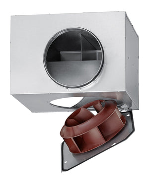 EC Radial-Rohrventilator mit geräuschgedämpftem, flachem Gehäuse. Gehäuse aus verzinktem Stahlblech mit schalldämmender, über 50 mm starker Mineralwolle-Auskleidung. Serienmäßige Lieferung saug- und druckseitig mit Anschlussstutzen und Lippendichtung für Normrohr-Durchmesser. Motor-Laufrad-Einheit ausschwenkbar zur Reinigung und Revision. Laufrad: Energiesparendes Radiallaufrad mit rückwärts gekrümmten Schaufeln aus hochwertigem Kunststoff. Für geräuscharmen Lauf dynamisch gewuchtet. Antrieb durch energiesparenden, drehzahlsteuerbaren EC-Außenläufermotor in Schutzart IP44 mit höchstem Wirkungsgrad. Wartungs- und funkstörungsfrei, kugelgelagert. Integrierte elektronische Temperaturüberwachung für EC-Motor und Elektronik. Stufenlose Drehzahlsteuerung mit Potentiometer oder stufenlose Drehzahlregelung mit Universal-Regelsystem EUR-EC. Anschluss über serienmäßiger Klemmenkasten (IP54) außen am Gehäuse.