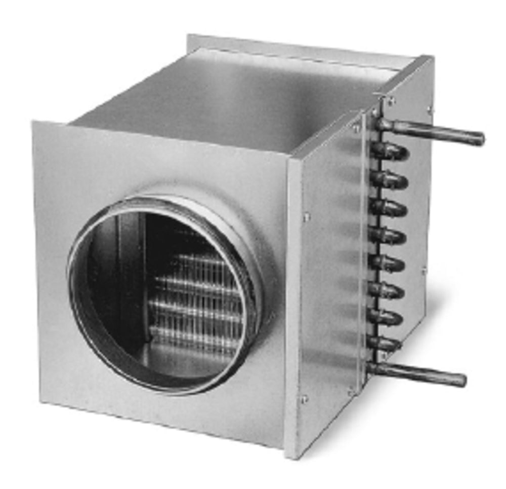 Kompaktes Warmwasser-Heizregister zum Rohrstrecken-Einbau. Gehäuse aus verzinktem Stahlblech mit beidseitigen Anschlüssen mit Gummi-Lippendichtung zum Einbau in Normrohre. Wärmetauscher: Kupfer-Rohre, aufgepressten Aluminium-Lamellen. Betriebstemperatur max. 100 °C, Betriebsdruck max. 8 bar. Wasseranschlussrohre mit Außengewinde. Wasseranschlussseitig zwei Revisionsdeckel zur einfachen Montage.