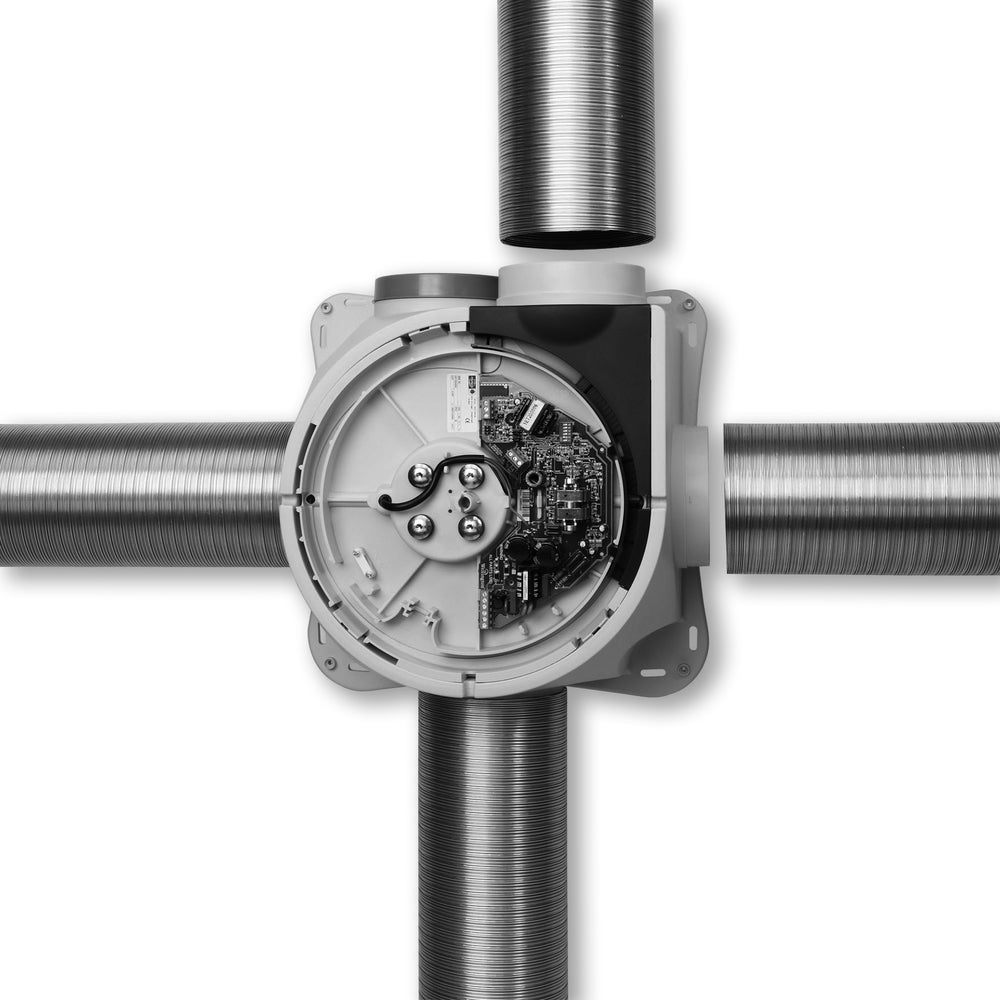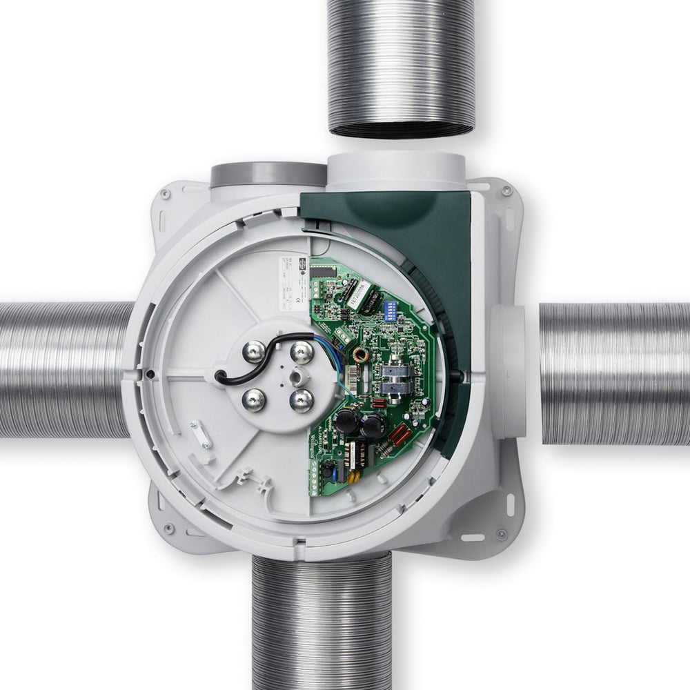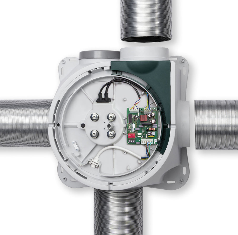 Zentralentlüftungsbox in kompakter Bauweise, mit vier Abluftansaugstutzen und einem Luftaustrittsstutzen Robustes Gehäuse aus schlagfestem Kunststoff, hellgrau. Die vier Ansaug- und der Luftaustrittsstutzen sind für Rohre der NW 100 und 125 ausgelegt ( 4 Reduzierungen im Lieferumfang enthalten). Ventilatorbetrieb in drei Stufen mittels Betriebsschalter DSZ (Zubehör) möglich. Zur individuellen Leistungsanpassung stehen neun Drehzahlen duch DIP-Switches auf der Antriebselektronik zur Verfügung. Geräuscharmes Radial-Laufrad aus Stahl in aerodynamisch optimierter Spirale. Einströmung über Düse. Energiesparender elektronisch kommutierter Gleichstrom-Außenläufer-Motor mit Kugellager für Dauerbetrieb. Hoher Wirkungsgrad auch bei Regelbetrieb. Wartungs- und funkstörfrei.