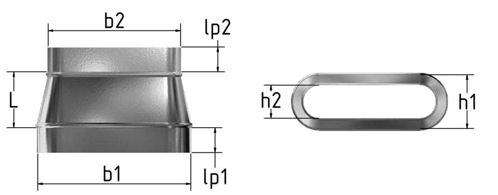 m+a Reduzierung USO oval-oval, symm., b1xh1=930x200mm auf b2xh2=480x150mm, Einbaulänge=375mm