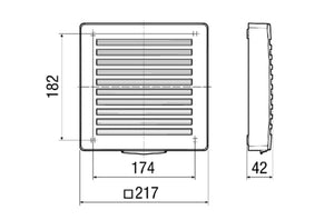 Außenabdeckung aus Kunststoff. Farbe verkehrsweiß (ähnl. RAL 9016). Mit integrierter Kondensatabtropkante. Die Gitter sind strömungsoptimiert, um Luftverwirbelungen zu minimieren und die Abluft wird von der Außenwand fern gehalten. Somit werden die Verfärbungen und die Schmutzablagerungen an der Außenfassade deutlich minimiert. Eine Außenabdeckung wird als notwendiges Zubehör für die Endmontage-Sets PP 45 K, PP 45 O und PP 45 RC benötigt.Artikel: PP 45 AK, Einbauort: Außenwand, Material Gehäuse: Kunststoff, Farbe: verkehrsweiß, ähnlich RAL 9016, Gewicht: 0,302 kg, Breite: 217 mm, Höhe: 217 mm, Tiefe: 42 mm