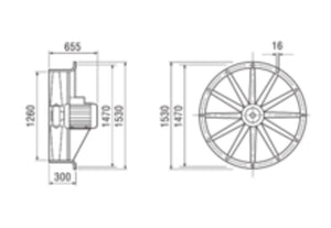 8- bis 10-blättrige Flügelräder aus Kunststoff. Dynamisch gewuchtet gemäß Gütestufe 6.3, DIN ISO 1940. Hohe Schutzart IP 55. Einfache Anbringung mittels Wandring. Schutzgitter auf der Saugseite, lackiert. Förderrichtung: Nur für Entlüftung (Rechtslauf). Motor: Nicht zur Förderung wasserdampfgesättigter Luft geeignet. Überlastungsschutz mit bauseitigem Motorschutzschalter. Drehzahlregelung mit Frequenzumrichter MFU. Wärmeklasse F. Elektrischer Anschluss: Im Klemmkasten auf Motor. Sicherheitshinweise: Für Ventilatoren mit Leistungsaufnahme > 4 kW muss zur Anlaufstrombegrenzung ein bauseitiger Stern-/Dreieckschalter verwendet werden. Der Ventilator darf nur in Betrieb genommen werden, wenn der Berührungsschutz des Laufrades gemäß DIN EN ISO 13857 gewährleistet ist. Nicht mit Transformator regelbar.Artikel: DAS 125/8, Ausführung: Stahlring, Fördervolumen: 56000 m3/h, FördervolumenNenn: 42900 m3/h / im opt. Wirkungsgrad, Druck pfs, Nenn: 215 Pa - im opt. Wirkungsgrad, Drehzahl nNenn: 730 1/min - im opt. Wirkungsgrad, Drehzahl: 730 1/min, Laufradtyp: axial, Drehzahlsteuerbar: ja, Reversierbarkeit: nein, Spannungsart: Drehstrom, Bemessungsspannung: 400 V, Netzfrequenz: 50 Hz, Nennleistung: 3448 W / im opt. Wirkungsgrad, INenn: 6,9 A / im opt. Wirkungsgrad, IMax: 8,9 A, Schutzart: IP 55, Wärmeklasse: F, Einbauort: Wand, Einbaulage: senkrecht, Material Gehäuse: Stahlblech, lackiert, Gewicht: 147 kg, Nennweite: 1250 mm, Breite: 1530 mm, Höhe: 1530 mm, Tiefe: 655 mm, A: 655 mm, B: 1260 mm, Fördermitteltemperatur bei Nennstrom: 50 °C, Fördermitteltemperatur bei IMax: -20 °C bis 50 °C, Gesamteffizienz e: 35,5 %, Messkategorie: C, Effizienzkategorie: statisch, Effizienzgrad N: 38, VSD erforderlich: nein, Herstellungsjahr: siehe Typenschild, Herstellername / Amtliche Registriernummer / Niederlassungsort des Herstellers: Maico Elektroapparate-Fabrik GmbH / Registergericht Freiburg, HRB 601233 / Villingen-Schwenningen, PBEP / FördervolumenBEP / Pfs, BEP: 3,448 kW / 42900 m3/h / 215 Pa, nBEP: 730 1/min, spezifisches Verhältnis: ca. 1, Informationen zur Zerlegung und Entsorgung: siehe Montageanleitung, Informationen zu Einbau, Betrieb und Instandhaltung: siehe Montageanleitung, Verwendete Gegenstände bei der Effizienz-Messung, die nicht durch die Messkategorie beschrieben sind: -, IBEP: 6,9 A, SchallleistungspegelLWA7: 88 dB(A)