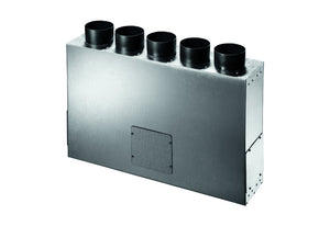 Luftverteiler-Kasten aus Blech mit schallgedämmer Innenauskleidung. Frontblechplatte versehen mit integrierten Kunststoff-Einschubadaptern MF-WE für den passgenauen und schnellen Einschub der Flexrohre MF-F. Bei der Auslieferung sind jeweils die Hälfte der Einschubadapter mit Verschlusskappen versehen. Ausgestattet mit 4 Gummi-Befestigungswinkeln für schallentkoppelte Wand-/ Deckenmontage. 3 demontierbare Revisionsanschlussplatten (2 x seitlich, 1 unten am Verteilerkasten). Stirnseitiger Hauptrohranschluss (NW 125/NW 160) kann versetzt werden auf Revisionsanschlussplatten. Einsatz als Durchgangs-bzw. 90°-Verteiler. Notwendiges Zubehör: Dichtungsringe MF-FDR.Artikel: MF-BV90-125-5, Luftrichtung: Be- oder Entlüftung, Volumenstrom: 250 m3/h / empfohlen, Material: Stahlblech, verzinkt, Gewicht: 9,18 kg, Anschlussdurchmesser: 125 mm, Anschlussdurchmesser Flexrohr: 90 mm, Anzahl Anschlussstutzen: 5, Breite: 650 mm, Höhe: 150 mm, Tiefe: 450 mm