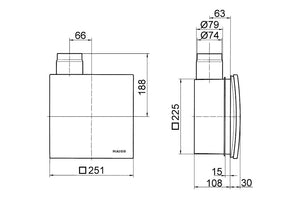 Ausführung mit Grundlastschaltung und Verzögerungszeitschalter: Das Gerät läuft im Dauerbetrieb bei 35 m3/h. Umschaltung auf Volllast mit Einschaltverzögerung von ca. 50 sek. Nachlaufzeit der Volllast ca. 6 min. Nicht drehzahlsteuerbar. Schaltungsvariante: Mit einem zusätzlichen Schalter kann die Grundlast ein- bzw. ausgeschaltet werden (siehe Schaltbilder im Internet). Ventilator mit Abdeckung und G2-Filter zum Einbau in Unterputzgehäuse. Für Einraum- oder Zweiraumentlüftung mit einem einzelnen Ventilator (Ausnahme: Ausführung H und GVZC EC). Elektrische Steckverbindung für schnelle Montage des Ventilators im Gehäuse. Problemloser Filterwechsel ohne Werkzeug. Abdeckung um +- 5° drehbar, dadurch Ausgleich bei schief eingesetztem Gehäuse möglich. Montagefreundliche Schnappbefestigung des Ventilators im Gehäuse. Farbe verkehrsweiß ähnlich RAL 9016. Alle MAICO ER-Geräte entsprechen der Schutzart IP X5 und können somit im Bereich 1 nach DIN VDE 0100-701, auch bei Strahlwasser, eingebaut werden. Details siehe Planungshinweise. Schutzklasse II. Die extrem steile Kennlinie zeigt das hohe Druckvermögen der ER-Ventilatoren. Robuster energiesparender Kondensatormotor. ER 60 GVZC EC: mit energiesparendem EC-Motor. Motor mit thermischem Überlastungsschutz. Wartungsfrei, mit beidseitig geschlossenen Kugellagern. Volumenstrom-Kennlinie und Leckluftrate geprüft vom TÜV Bayern e.V. Leckluftvolumenstrom < 0,01 m3/h. Schachtpegeldifferenz gemäß DIN 4109, geprüft vom IAB Oberursel. Mit VDE-Zeichen.Artikel: ER 60 GVZ, Ausführung: Grundlast- und Verzögerungszeitschaltung, Fördervolumen: 35 m3/h / 62 m3/h, Drehzahl: 850 1/min / 1250 1/min, Luftrichtung: Entlüftung, Drehzahlsteuerbar: nein, SEC average: -3,43 kWh/(m2*a), Spannungsart: Wechselstrom, Bemessungsspannung: 230 V, Netzfrequenz: 50 Hz, Leistungsaufnahme: 10 W / 21 W, IMax: 0,12 A / 0,16 A, Schutzart: IP X5, Netzzuleitung: 5 / 1,5 mm2, Einbauort: Wand / Decke, Einbauart: Unterputz, Systemart: dezentral, Material: Kunststoff, Farbe: verkehrsweiß, ähnlich RAL 9016, Gewicht: 1,5 kg, Filterklasse: G2, Ausblasrichtung: seitlich, Breite: 250 mm, Höhe: 250 mm, Tiefe: 150 mm, Fördermitteltemperatur bei IMax: 40 °C, Nachlaufzeit: 6 min, Einschaltverzögerung: 50 s, Schalldruckpegel: 26 dB(A) / 36 dB(A) / Angabe gemäß DIN 18017-3 bei einer äqivalenten Absorptionsfläche AL = 10 m2, Nennweite: 75 mm / 80 mm