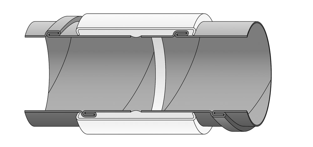 Wirtschaftliche Rohrverbindung für kleinere Rohr-Ø (71 bis 315 mm) bestehend aus einem stabilen profilierten Blechmantel, dessen Enden durch ein solides Bolzenschloss mit Hilfe einer Schraube zusammengezogen werden. Eine durchgehende breite Dichtungseinlage dichtet den Rohrstoß sicher ab. Die aufgekanteten Enden des Blechmantels krallen sich in die Rohrwand und verhindern das axiale Ausziehen der Rohre. Der Potentialausgleich ist gewährleistet.