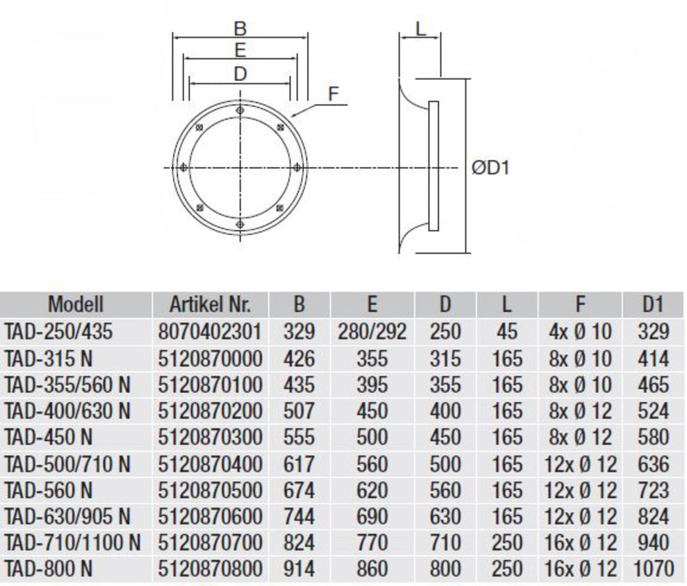 S&P Ansaugdüse TAD-710/1100 N mit Schutzgitter und Anschlussflansch