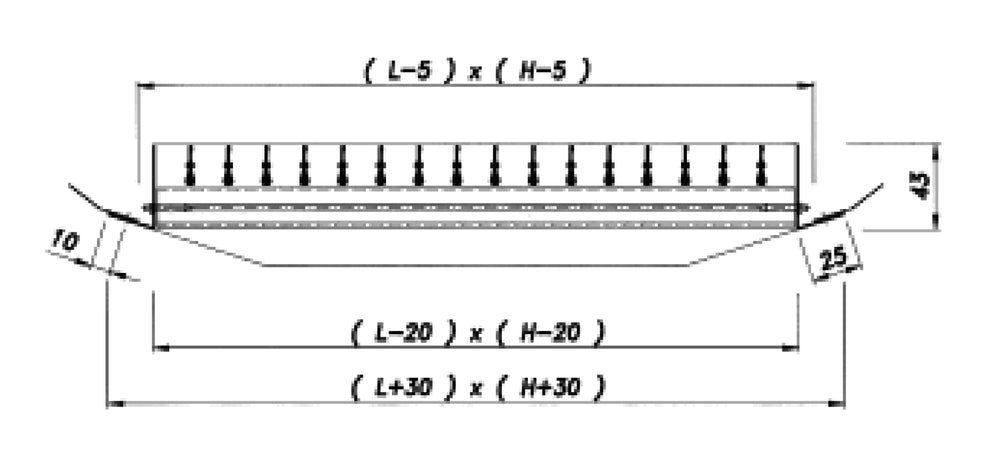 Siehe die Maßtabelle unten. Die Abmessungen der Öffnung betragen stets L-5 mm x H-5 mm. Für ein Gitter mit Sollmaß, 425 x 225, muss die Öffnung 420 x 220 mm groß sein.
