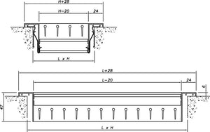 Abmessungen beim Einsatz mit Einbaurahmen: Werden die Gitter mit einem Einbaurahmen fixiert, entspricht die Größe der Öffnung dem Sollmaß des Gitters. Zum Beispiel würde ein Gitter 525 x 325 eine Öffnung gleicher Abmessungen benötigen.