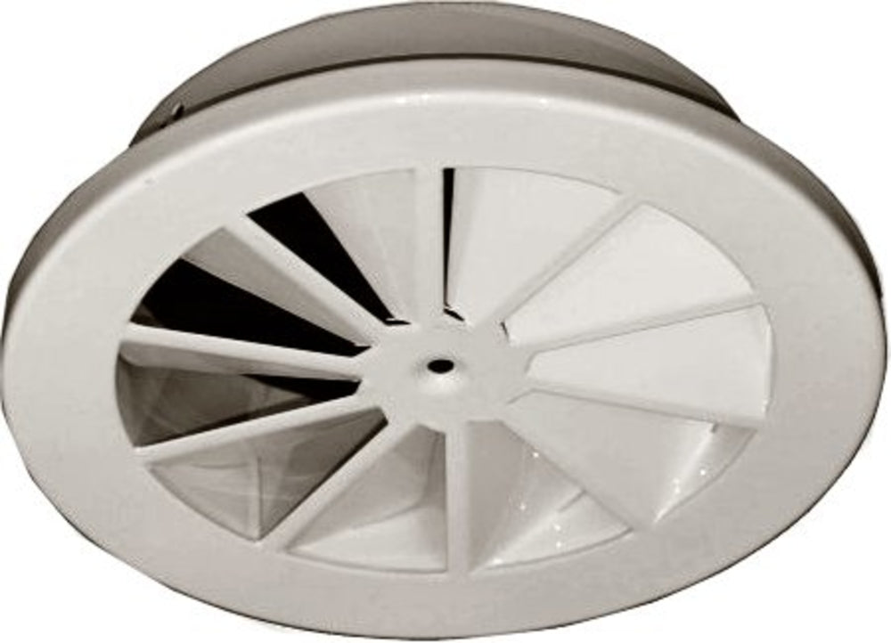 Runde Drallauslässe mit feststehenden Schaufeln. Diese Auslässe werden in quadratische Deckenfelder eingesetzt, um als Austauschkassetten in Decken zu dienen. Aus Stahlblech gefertigt und in RAL 9010 weiß beschichtet. Sonderbeschichtungen auf Anfrage.