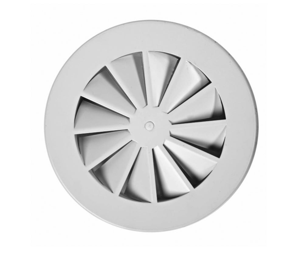 Runde Drallauslässe mit feststehenden Schaufeln. Diese Auslässe werden in quadratische Deckenfelder eingesetzt, um als Austauschkassetten in Decken zu dienen. Aus Stahlblech gefertigt und in RAL 9010 weiß beschichtet. Sonderbeschichtungen auf Anfrage.