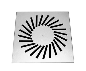 späth Dralldurchlass Serie DF-RO. Hochinduktiver Dralldurchlass (quadratisch / rund) für Zuluft/Abluft aus verzinktem Stahlblech mit verstellbaren, radikal angeordneten Luftleitlamellen. Montage über Mittelschraube.