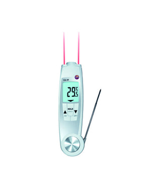 Wareneingang, Theken-Auslage, Lagerung: Das Einstech-Infrarot-Thermometer testo 104-IR wurde für die schnelle, zuverlässige Temperaturkontrolle im hektischen Praxisalltag entwickelt. Es eignet sich ideal für die Lebensmittelindustrie, für Restaurants und den Einzelhandel.Robust und praxistauglich: stabiles Klappgelenk, wasserdichtes Gehäuse (IP65), passt in die Jackentasche Produktvorteile: Oberflächentemperatur und Kerntemperatur messen Infrarot-Messgerät mit Laser-Messfleckmarkierung und Einstechfühler HACCP / EN 13485 konform