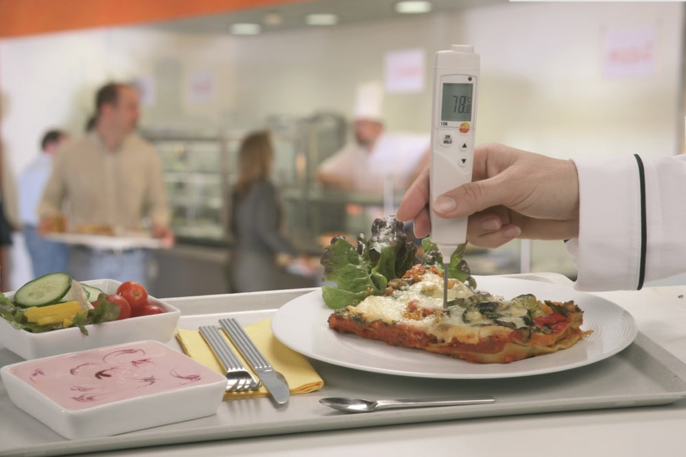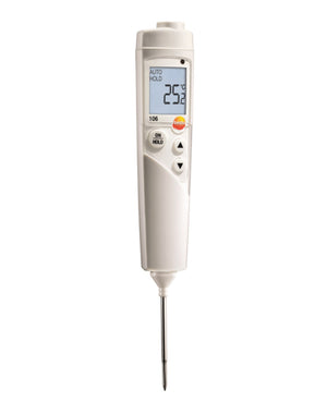 Praktisch zur schnellen und sicheren Temperatur-Messung bei Lebensmittelkontrollen: Mit dem kompakten, handlichen Lebensmittelthermometer testo 106 sind Sie bestens gerüstet, um in Großküchen, (System-)Gastronomie, Supermärkten oder beim Lebensmittel-Transport die Kerntemperatur der Waren zu messen.Für zügiges und genaues Messen der Kerntemperatur (z.B. bei Lebensmittelkontrollen) Produktvorteile: In Verbindung mit TopSafe-Schutzhülle (zusätzlich bestellbar) wird das testo 106 zu einem EN 13485 zertifizierten und HACCP-konformen Thermometer Optischer und akustischer Alarm bei Grenzwert-Überschreitung (Grenzwerte individuell einstellbar)