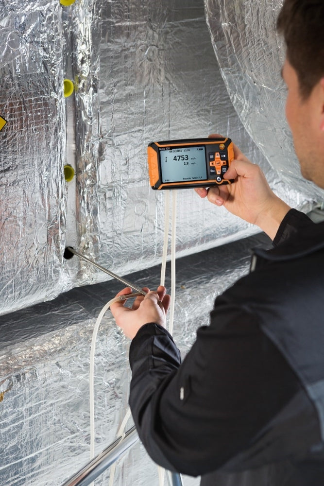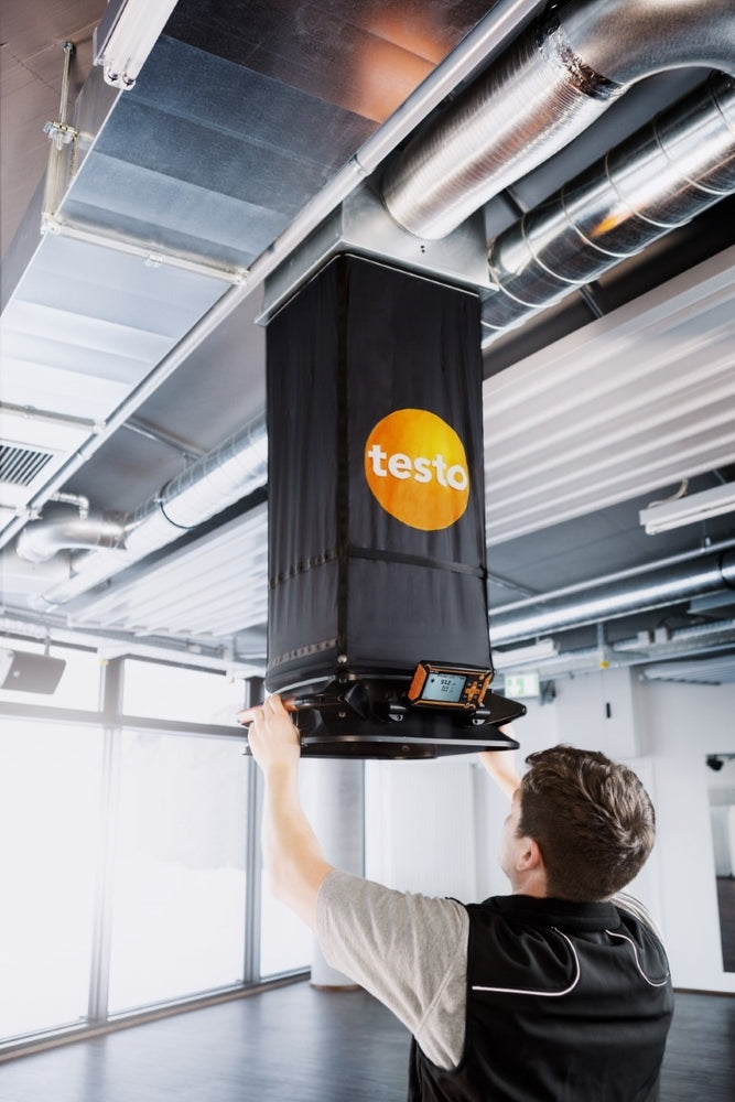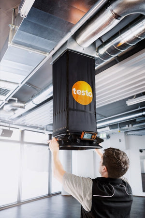 Sichern Sie sich die Volumenstrom-Messhaube testo 420 für größere Deckenauslässe und profitieren gleich mehrfach bei der Wartung an RLT-Anlagen. Denn die Messhaube mit abnehmbarem Messgerät ist nicht nur einzigartig leicht, sie garantiert auch präzise Volumenstrom-Berechnungen an Drallauslässen.