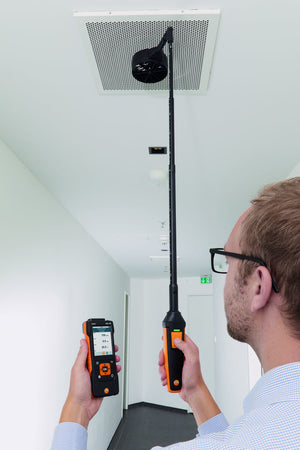 Clever: Falls Sie bereits eine unserer Strömungssonden mit universellem Handgriff und ausziehbarem Teleskop besitzen, können Sie dieses Teleskop mühelos mit einer der 100-mm-Flügelrad-Sonden mit universellem Handgriff kombinieren. Ergänzen Sie einfach den optionalen 90°-Winkel für Messungen an Deckenauslässen.