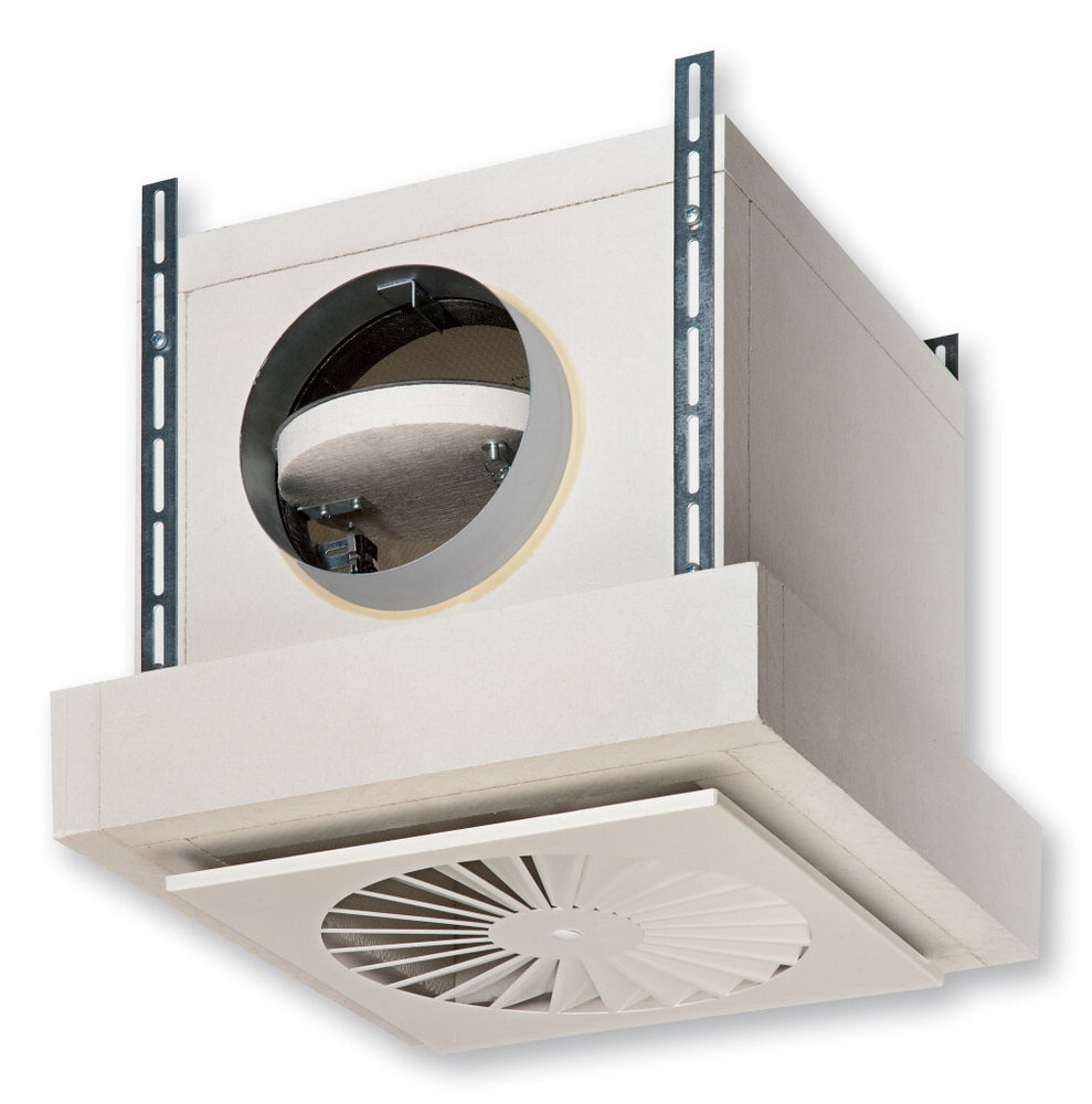 Quadratische Brandschutzklappe zum Absperren von Luftleitungen in selbständig feuerwiderstandsfähigen Unterdecken. Kombinationen mit nichtbrennbaren Drall- und Deckenluftdurchlässen erfüllen hohe lüftungstechnische Anforderungen. Geeignet für Zu- und Abluft. Funktionsfertige Einheit enthält ein feuerbeständiges Klappenblatt und eine Auslöseeinrichtung. Feuerwiderstandsklasse K30-U. Geeignet zum Einbau in selbstständig feuerwiderstandsfähige Unterdecken F30, als Plattendecken in geschraubter und gespachtelter Ausführung, Metalldecken, sowie in Gipsfriesen von Metalldecken. Thermische oder thermoelektrische Auslösung für 72 °C oder 95 °C (Warmluftheizungen) Auslösetemperatur. Ausführungen mit Federrücklaufantrieb zum Öffnen und Schließen der Brandschutzklappe, unabhängig von der Nenngröße, auch bei laufender Lüftungsanlage, beispielsweise zur Funktionsprüfung.
