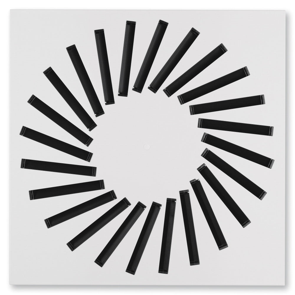 Deckendralldurchlässe mit quadratischem oder rundem Frontdurchlass. Als Zuluft- und Abluftdurchlass für Komfortbereiche mit maximal 35-fachem Luftwechsel. Frontdurchlass mit einzeln manuell verstellbaren Luftleitelementen für drallförmige horizontale Luftführung mit hoher Induktion. Zum Einbau in abgehängte Decken aller Art. Einbaufertige Komponente, bestehend aus dem Frontdurchlass mit radial angeordneten, einzeln verstellbaren schwarzen oder weißen Luftleitelementen und einem Anschlusskasten, bei Zuluft mit Luftverteilelement, horizontal oder vertikal angeordnetem Anschlussstutzen, Traverse und Bohrungen oder Aufhängelaschen zur Abhängung. Mittelschraubenbefestigung des Frontdurchlasses an der Traverse, verdeckt durch eine Zierkappe. Anschlussstutzen, passend für Luftleitungen nach EN 1506 oder EN 13180. Schallleistungspegel des Strömungsgeräusches gemessen nach EN ISO 5135.
