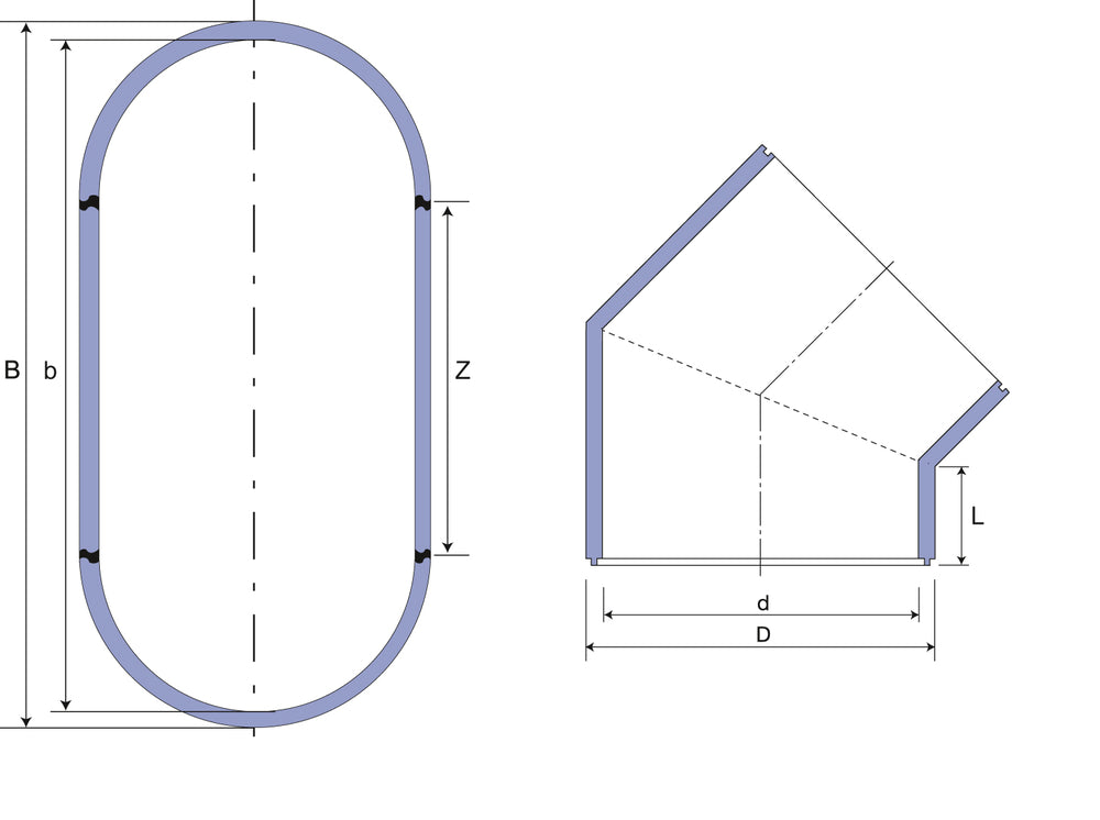 Ovalrohr-Bogen 45° horizontal aus hochdämmenden PUR-Hartschaum, Innenbeschichtung mit GFK brilliant ( Glasfaserverstärkter Kunststoff )